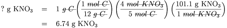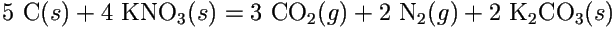 To make an explosive, what we really need is a solid or liquid oxidant which can be intimately mixed with the reductant, or fuel, thus eliminating the need for atmospheric oxygen. The first material to be used in this way was saltpeter, or potassium nitrate. A sort of gunpowder can be made from charcoal and saltpeter alone: Given the balanced equation, we can use stoichiometry to determine the relative weights of charcoal and saltpeter: That is, for every 1 gram of charcoal, we require 6.74 grams of saltpeter. If there is too little saltpeter, charcoal will remain after the saltpeter as been used up, which means that there was charcoal that could have burned, but didn't. The residue which remains will be black, from the leftover charcoal. If there is too much saltpeter, the charcoal will be consumed and some unused saltpeter will remain. The residue will be white, from the leftover saltpeter. But if mercury and sulfur, oxidant and reductant, are perfectly balanced no salt at all will remain from their union and the maximum energy will be delivered from the available fuel.
