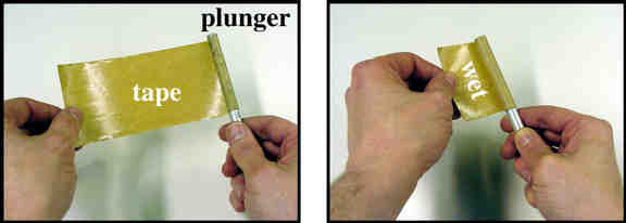 The bodies of your rockets will be tubes rolled from 3-inch wide paper package tape, as shown in Figure 17-2. Many of my students have never seen paper tape before, but it can still be bought at office-supply stores. I prefer the gummed variety, which becomes sticky only when wet.[3] To roll a rocket tube, carefully wet only the very edge of a 15 cm long piece of tape and stick it to the large-diameter end of the plunger, the end which has been built up with tape. Roll the tape around the plunger, wet the last 5 cm, and finish rolling the tube. If you were careful in wetting the very edge, the tube will stick to the plunger while you roll it, but will twist off when you are done. You should now have a paper tube, 3 inches long and slightly more than 3/8 inch in diameter. Try pushing a plug into the tube—it should go in easily but fit snugly. If it is too tight, add more tape to build up the plunger; if too loose, remove some tape from the plunger. Once you have the hang of it, roll two or three good tubes for your first foray into rocketry.