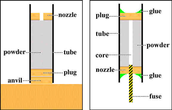 Push a plug into a rocket tube and set it on one of your anvils, as shown in Figure 17-3. Fill the tube with powder using a spoon or spatula, preferably a metal one to minimize the danger of static discharge. Push the small-diameter end of your plunger, the end without the tape, into the tube and press the powder all the way to the bottom. Give the plunger three good raps with a rubber mallet to compact the powder into a solid mass. Remove the plunger, refill the tube with powder, reinsert the plunger, and give it another three raps with the rubber mallet. Repeat this sequence until the rocket is between 2/3 and 3/4 full. Insert a nozzle into the tube and push it all the way down until it rests on the powder. Remove the tube from the anvil and apply glue to the outside of both the plug and the nozzle, taking care not to fill in the nozzle hole.[6] When the glue has set you may use scissors to trim away any excess paper from the ends of the rocket. The powder made from 1 g of sulfur will be enough for you to make two or three rockets.
