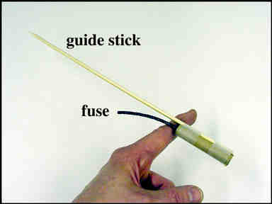Two more items complete the rocket: the guide stick and the fuse. For guide sticks I use 12-inch bamboo skewers, available in grocery stores for making shish kebab. Use two strips of cellophane tape to attach each stick securely to its rocket. I use commercial "green visco" fuse, available wherever pyrotechnic supplies are sold . Those wishing to make their own fuse may consult Reference [48]. Insert a 7 cm length of fuse into the nozzle of each of your rockets. Ideally, the finished rocket should balance on your finger where the fuse enters the nozzle, as shown in Figure 17-5. If your rocket is stick-heavy, slide the tube toward the middle of the stick. If it is tube-heavy, slide it away from the middle of the stick. If you adjust any stick, secure it with an extra piece of tape. Number your rockets and write you name on each one in case you are able to recover them.