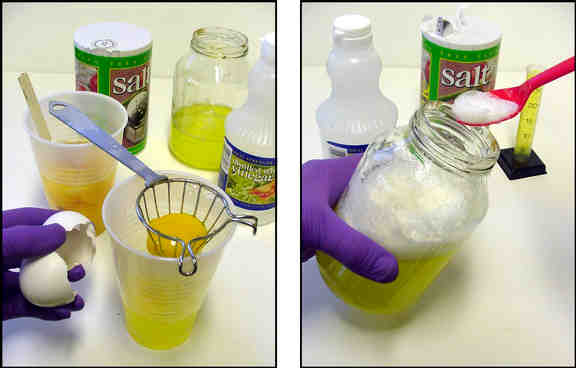 To make the albumin/salt solution, you need to separate the yolks from the eggs. One egg at a time, separate the yolk from the whites using your favorite method and place the egg white into a cup. If any egg white is contaminated by yolk, discard the whole egg; egg yolks contain sulfur, which will degrade the quality of your print. Examine each egg white and remove any dirt or bits of eggshell. Once an egg white is free of debris, pour it from the cup into a one-pint glass jar. Continue separating eggs until your jar contains a dozen clean egg whites. To your jar of egg whites add 12 mL of white household vinegar and 12 g of sodium chloride. Put the lid on the jar and shake it until a good head of froth develops. Allow the froth to rise to the surface and then remove it with a spoon, as shown in Figure 23-1(R), leaving clean, clear emulsion in the jar. The emulsion may be prepared in advance and stored in the refrigerator indefinitely. If the emulsion becomes dirty after repeated use, simply shake it and spoon off the froth; most of the impurities will be caught in the froth. A dozen eggs produce enough emulsion for very many prints.