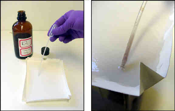 When you are ready to coat your paper, remove your albumin solution from the refrigerator and allow it to warm to room temperature. Cut your paper to a convenient size and fold up about 1 cm along each edge of the paper. The effect is that you are forming your paper into a shallow dish. You will need to fold the corners in so that all four edges stand up; do not cut the corners; your paper dish needs to be water-tight. Using a medicine dropper or transfer pipette, withdraw some emulsion from your jar. By putting the tip of the pipette well below the surface, you can extract very clean emulsion, free of bubbles and froth. Deliver the emulsion to your paper dish and continue adding emulsion until the bottom of your dish is covered. You can rock your paper dish from side to side and move emulsion to dry areas with your pipette. The goal is to completely cover the paper with clean, bubble-free emulsion. Once the bottom of your paper dish is completely covered with emulsion, allow it to sit for 3 minutes. At the end this time, use you pipette to return the remaining emulsion to the jar.[2] Then fill your pipette with fresh emulsion and use it to wash any bubbles or dirt from your paper, as shown in Figure 23-2(R). Allow your coated paper to dry overnight; you may lean it vertically against a wall, stand it up in a lab drawer or cabinet, or hang it from a line with clothes pins. Coated paper may be stored indefinitely.[3]