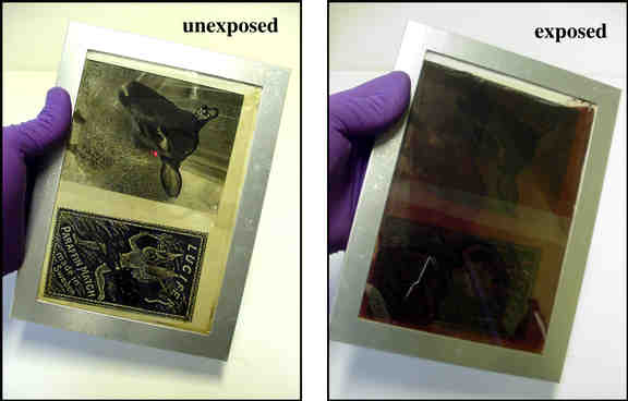 You will also need a printing frame to make your exposure; a standard picture frame works well. The negative and the sensitized paper must be loaded into the printing frame in dim light, the same light you used for sensitizing your paper. Place the negative against the glass of the picture frame. Flatten out your sensitized paper dish and place the sensitized side of the paper against the negative. Then assemble the back of the picture frame so that the negative is held tightly against the sensitized paper so that it holds the sensitized paper tightly against the negative.