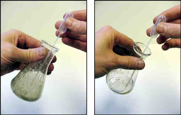 Chances are your actual yield is higher than your theoretical yield, meaning that not all of the HCl has departed. Add 5 mL of water to the flask with a medicine dropper or transfer pipette and swirl the flask to bring as much of the solid as possible into solution. Fill the pipette with the resulting solution and use it to wash all of the solid from the sides of the flask down into the bottom, as shown in Figure 20-4. Then test the solution by placing the last drop from your pipette on a strip of pH test paper; it will probably be acidic. You are about to calcine this solution a second time, but the concentrated solution may spatter as it dries out. To prevent this, place a cork loosely into the mouth of the flask and place it back on the heat source, as shown in Figure 20-3(L). Once the solution has stopped spattering the cork may be removed, as shown in Figure 20-3(R). Calcine for a total of 10 minutes and then cool for 10 minutes. Weigh the cool flask once again and calculate the yield of your product. It should be less than before if you have successfully driven off more HCl.