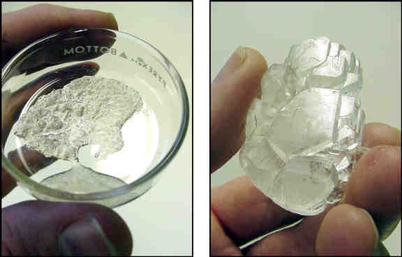 The sal mirabile which brought a glow to Glauber's cheek, was not anhydrous sodium sulfate, but sodium sulfate decahydrate, Na2SO4·10 H2O. To make it, add only 3 mL of water to your flask, not 5 as before. Warm the flask gently over the spirit lamp or hot-plate, but do not bring it to a boil. The flask should not be so hot that you cannot hold it comfortably in your bare hand. Swirl the liquid around the flask and use your pipette as before to rinse the solid from the sides of the flask. Your goal is to get as much sodium sulfate into as little warm water as is physically possible. Spend a full 10 minutes swirling, rinsing, and warming; this time is well spent. Not all of the solid will dissolve. Use your pipette to transfer the warm, saturated solution to a small Petri dish or watch glass and allow it to cool. If you have used the fire gently and with great skill, you will witness the behavior which gave Glauber such high opinion of this salt: