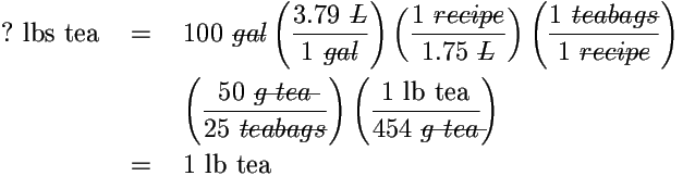 The tea holds complications of its own. You used tea in bags for your smaller batch, but your wholesaler sells bulk tea by the pound. A box of 25 tea-bags weighs 50 grams, so: