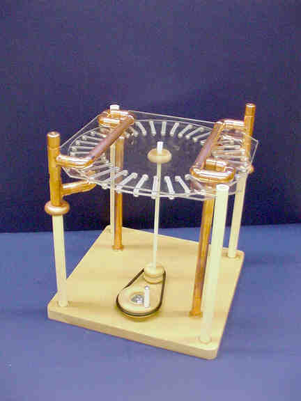 A. D. Moore introduced to the world this variety of influence machine which he dubbed a "Dirod," the name deriving from the combination of "disk" and "rod." His book, Electrostatics, has become a classic of amateur science. It may be ordered from the Caveman Bookstore. The Dirod is one of the most reliable electrostatic generators. The Dirods described here will operate even under humid conditions that would render other electrostatic devices inoperable. Dirods come in two varieties, cylindrical and radial. Radial Dirods have the rods mounted parallel to the disk. This makes possible an extremely simple and efficient design. Model #8 is approximately 12"x12"x12", has a 11.5" disk and 36 2" rods. The collectors are constructed from 1/2" copper tubing to minimize corona losses. With a capacitor, it will produce 5" sparks between the two collectors. Instructions for building Models 6, 7, and 8 from scratch are given in the construction manual (HTML, PDF). In addition, a complete kit is available for Model 8, including all parts shown in the photograph below. You will need a tubing cutter, fingernail-polish remover, adhesive (I recommend Goop), a screwdriver, a wrench, and cellophane tape. The kit may be ordered from the Caveman Marketplace.