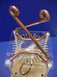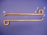 The little gap included with the #6 is all fine and good, but you will get bigger sparks with a rod gap. The parts are easy to come by at any hardware store. You need two 1 foot lengths of copper tubing, six street elbows, two endcaps, and two 45 degree elbows. Arrange them as shown in the figure and glue them together, allowing for electrical contact, as usual. You can save a couple of bucks by foregoing the street elbows. Just place the endcaps on the ends of the pipes, but corona leakage will rob you of about a quarter inch of spark.