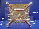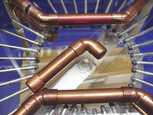 There are two small brush holes and two large collector holes in the corona shield. Remove the protective paper from both sides of the shield and place it on the leg sockets, with the collector holes at the lower right and upper left corners of the figure (seen from above). Arrange the metal pipe and fittings as shown. Collector (t) goes directly over the brush hole. A tee (s) passes through the hole in the shield. The collector is connected to the inductor (w) via two 45 degree elbows (u) and a length of pipe (v). The end of the inductor is sealed against corona loss by an endcap. Study the figure carefully. It is imperative that (t) lies directly over the brush hole in the corona shield and (w) lies directly over the neutral brush. Both (t) and (w) should line up with the rods as they pass beneath. Only after you are confident that the shield, pipes, and fittings have been arranged correctly, glue the pipe to the fittings, the fittings to the shield, and the shield to the leg sockets. Do not glue the leg sockets to the legs as you will need to be able to remove the shield if the belt ever needs replacing.