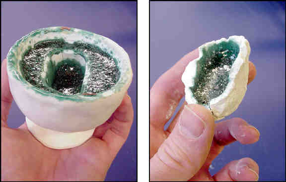 If you completed the mold of Figure 10-3(R) you have only to pack your mixed glass ingredients into the mold. If you have no mold, you must at least coat the walls of your crucible with investment, as shown in Figure 10-2(L), to prevent the glass from sticking to the walls of your crucible. Fill your mold or crucible with the mixed glass ingredients, cover your crucible with its lid, and fire it to cone 05. When it returns from the kiln, remove the lid and use a knife or screwdriver to pry the investment from the crucible. Chip away at the investment to free your glass from its cocoon, as shown in Figure 13-2. A knife can be used to remove much of the investment, but a Dremel tool with a cutting disk is useful for removing it from the surface of the glass. Provide yourself with a bowl of water and use it to wash your glass object twice a minute, or so. The water will help to soften the investment and it will keep the glass cool. Since glass is much harder than investment, it is easy to remove the investment without fear of damaging the glass. The finished glass casting is shown in Figure 13-3(R).