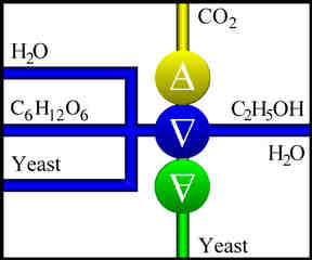 The fermentation process is summarized visually in Figure 4-2. This reactor, a fermenter, is symbolized by a stack of three circles, labeled by the alchemical symbols for air, water, and earth. This stack resembles a bottle, if you use a good bit of imagination, from which gas can escape at the top and solids can settle to the bottom. In the next section, we will use a 2-liter soft-drink bottle as a fermenter. The reactants, honey, water, and yeast enter from the left of the figure. The solid waste product, dead yeasts, exits the bottom of the figure from the circle labeled by the alchemical symbol for earth. The gaseous waste product, carbon dioxide, exits the top of the figure from the circle labeled by the alchemical symbol for air. The good stuff, the main product, a solution of ethanol in water, exits the right of the figure from the circle labeled by the alchemical symbol for water. You should familiarize yourself with these conventions, as similar schematics will be used throughout the book.