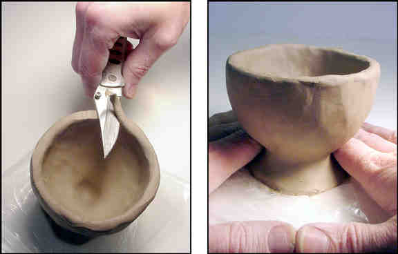 Use a knife to trim the lips of the crucible so that they are parallel to the table top, as shown in Figure 5-4. Manipulate your crucible so that its shape is symmetric and its walls smooth. Then allow it to air-dry for approximately 5 hours. When you return to it, the walls will have stiffened, making it less floppy and easier to work. Make fine adjustments to the shape and surface, eliminating any imperfections. If the surface is too dry, you can moisten your hands or use a damp sponge to make the surface smooth and free of cracks. You can also use a knife, spoon, or tongue depressor to remove bumps or other imperfections. If you do not have time to devote to the work, you can place your crucible into a plastic bag, a veritable time capsule, to prevent its drying out further. When you are satisfied with the shape of your crucible, allow it to air-dry for another 5 hours. After this second drying, the walls will be quite stiff and the surface of the clay cold to the touch. Rub a smooth stone or the back of a spoon over the surface, inside and out, to render the surface glossy. Before allowing your crucible to dry any further, you will need to make a tight-fitting lid for it.