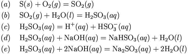 There are two oxides of sulfur: sulfur dioxide (SO2) and sulfur trioxide (SO3). When sulfur burns in air the product is sulfur dioxide, which we saw in Equation 9-2 as one of the products of the roasting of metal sulfide ores. Sulfur dioxide is a versatile compound; in the presence of a strong oxidant it plays the role of a reducing agent; in the presence of a strong reductant it acts as an oxidizing agent. As shown in Equation 18-2(b), it dissolves in water to form an acid, in this case a weak acid called sulfurous acid (H2SO3), which smells of rotten eggs. A mole of sulfurous acid reacts with a mole or two of sodium hydroxide to produce the salts, sodium bisulfite and sodium sulfite, respectively. While there has never been a large market for sulfurous acid or its salts, they are not entirely useless, as we'll see in Chapter 24. But by far the biggest demand in the acid world has always been for sulfuric acid.