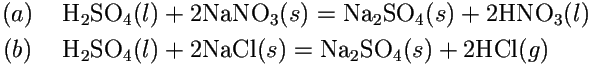 Sulfuric acid is certainly the most important of the acids, if raw tonnage is a measure, but there are two other acids of commercial importance, and it turns out that sulfuric acid can be used to manufacture them both. One of these, nitric acid, HNO3, is an even more powerful oxidizing agent than sulfuric acid. It will oxidize even those metals like lead, copper, and silver which are resistant to sulfuric acid. It will turn out to be important in the manufacture of such amazing applications as photographic film, fertilizers, explosives, and plastics. Nitric acid can be distilled from saltpeter and sulfuric acid, as shown in Equation 18-4. The other acid, hydrochloric acid, HCl, will play a significant role in the development of the chemical industry in the nineteenth century. It can be distilled from ordinary table salt and sulfuric acid. This triumvirate of mineral acids has played such a decisive role in the development of the world as we know it that they deserve a little mnemonic to help you remember their importance: