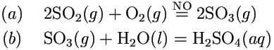 If more O2 were available, the NO would be converted back into NO2 and could react with more SO2 to produce more SO3. But that would regenerate NO, which could react with more O2 to make—well, you get the picture. The NO is not used up in this reaction; it simply changes to NO2 and back again. We say that nitrogen oxide is a catalyst for the oxidation of sulfur dioxide to sulfur trioxide. The entire process is summarized in schematic form in Figure 18-1. The first reactor is an old friend, a burner, first encountered in Figure 1-3. Equation (a) of Figure 18-1 is shorthand for Equation 18-3(a), the "NO" over the equal sign denoting the catalytic action of nitrogen oxide. The second reactor is called an absorber, which consists of nothing more than a container in which a gas can dissolve in a liquid.
