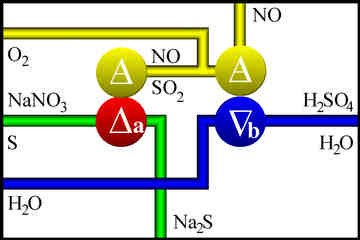 The production of sulfuric acid (H2SO4) requires a bit of ingenuity. As we have seen, combustion of sulfur by atmospheric oxygen produced sulfur dioxide, not sulfur trioxide. In Chapter 17 we saw that saltpeter could substitute for atmospheric oxygen in a redox reaction. Ward's contribution was to prepare a modified "gunpowder," one consisting of only sulfur and sodium nitrate.[2] When such a mixture is burned, it produces sulfur dioxide and nitrogen oxide, as shown in Equation 18-3(a). The nitrogen oxide liberated from the saltpeter reacts with atmospheric oxygen to produce nitrogen dioxide, which, in turn, converts sulfur dioxide to sulfur trioxide. If you add the three reactions of Equation 18-3(a), the nitrogen dioxides cancel out:
