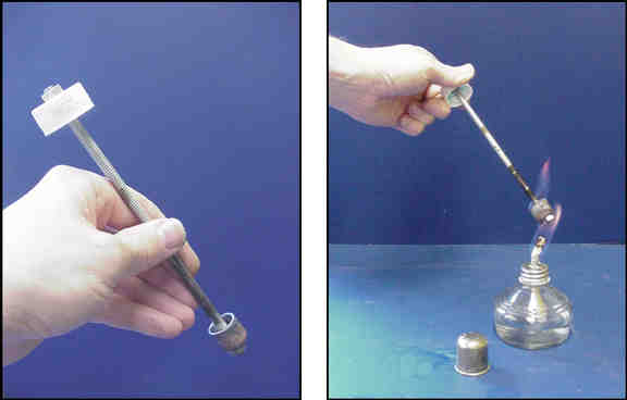 We need two reactors, a burner and an absorber. You can make a nifty burner from a pop bottle cap, a threaded steel rod, four nuts, and a copper plumbing fitting called an endcap. For the absorber you can use a 2-liter pop bottle. The sizes don't matter as long as the endcap will fit into the mouth of your pop bottle. I use a half-inch endcap and an eight-inch length of quarter-inch threaded rod. Drill a hole in the center of the endcap to fit the threaded rod and secure it with one nut inside and one nut outside the endcap. Do the same thing at the other end of the rod with the pop bottle cap. The open ends of the two caps should face each other, like it shows in Figure 18-2.