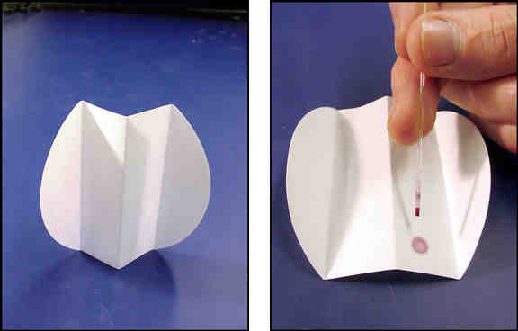 To make your chromatograms you'll need a piece of filter paper (90 mm in diameter), a pencil, a glass capillary tube (1 mm inside diameter, open both ends), a glass jar with a lid, and a solvent consisting of 75% white vinegar and 25% ethanol. Begin by folding the filter paper lengthwise into quarters and snipping off the ends with a pair of scissors. The resulting paper will be able to stand up, as shown in Figure 22-5(L). With a pencil[2] make a dot 1 cm from the bottom of the paper. Your goal is to place as much dye onto the smallest spot possible. To this end, dip the capillary tube into your dye; dye will climb into the tube by capillary action. Practice using the capillary tube by touching it briefly to a piece of paper towel. Some of the dye will be transferred to the towel, forming a spot. Practice making the smallest possible spots. Once you have some confidence, draw up some more dye into the capillary tube and spot the paper towel until a 1 cm column of dye remains in the tube. You will now deliver that 1 cm column of dye onto the pencil dot on your filter paper, as shown in Figure 22-5(R). Place the first spot onto the pencil mark and count to thirty, allowing the spot to dry. Place a second spot on top of the first and count to thirty. Continue to build this spot until you have delivered the entire 1 cm column of dye onto the filter paper. If you do a good job this "young" dye spot will be no more than 5 mm in diameter. If you mess up, just spot another paper until you get it right. You will now develop your chromatogram using a solvent composed of vinegar and ethanol.