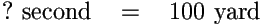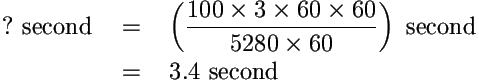 Notice, I put the yard in the bottom of the unit factor to cancel the problematic yard in the top, the one I need to eliminate. This leaves feet, which are not the same as seconds, so I need another unit factor to get rid of feet. Let's try (1mile/5280 feet). This gets rid of feet but leaves miles, which are not the same as seconds. It seems that we are getting nowhere, but we are, in fact, on the verge of a breakthrough. Of all the unit factors we might write concerning miles, one stands out because it was given in the problem: (60 miles per hour) = (60 miles/hour). The word per is another way of saying "divided by", and in a word problem always indicates a unit factor. We need the miles in the bottom of the unit factor, so we just turn it upside down. Now we're getting somewhere! Hours remain on the right and this can be converted to seconds with two more unit factors. Unit factors have been used to connect the units of the question to the units of the answer.
