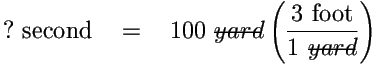 Now, a second is not the same as a yard, so we need a unit factor to get rid of this problematic unit on the right-hand side of the equation. There are many such unit factors, in fact, infinitely many of them. I won't agonize over the choice, I'll simply choose one and see if it gets me anywhere. Let's try (3 feet/1 yard).