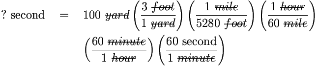 You may wonder how I knew to use (5280 feet/1 mile) rather than, for example, (1 foot/12 inches). The short answer is that I didn't know it for sure; I just tried it out to see whether it got me anywhere. Since unit factors are equal to one, and multiplying by one doesn't change a number, I can never go wrong with a unit factor. But some unit factors get me somewhere (toward the unit of the answer), while others don't. The slightly longer answer is that I knew from the statement of the problem, that "60 miles per hour" was a unit factor which contained both distance (the dimension of the problem) and time (the dimension of the answer) and so I knew that if I could get from yards to miles, I could get from miles to hours.