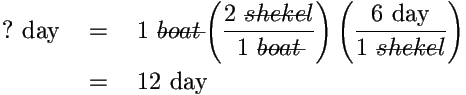 Notice that I actually wrote two equations, or mathematical sentences, one on top of the other. This is a way of keeping a long, complicated problem from getting out of hand. Here, "? day" equals (the first mess), and it also equals "12 days." Stacking the equal signs this way, I can show all the unit factors I used and then simplify the expression to get the answer. Let's try a more involved problem: