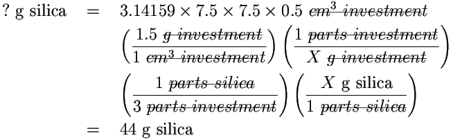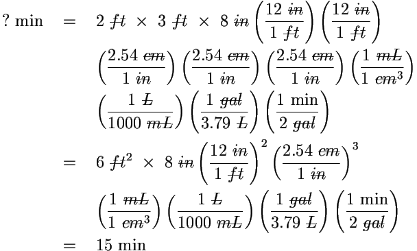 Either you're bored at this point because you've seen this before, or you're bewildered because anything mathematical scares you. If you're bored, you've probably skipped to the next chapter by now anyway, so I'll just add a little more for the bewildered guys. How did I know to start with "2 ft" instead of "2 gallons per minute?" The short answer is that I could just as well have started with (1 min/2 gal), turning this unit factor upside down so that "minutes," the unit of the answer, is in the top. The slightly longer answer is that I started with "2 ft" because I knew, intuitively, that if I doubled the length of the tub, it would take twice as long to fill. When doubling something in the problem would double the answer, we know it goes on top. The same thing was true for the width and the depth, so they also went on top. Conversely, if I were to double the filling rate from 2 gal/min to 4 gal/min, I know, intuitively, that it would take half as long to fill the tub. When doubling something in the problem would halve the answer, I know that it goes in the bottom, i.e. for this unit factor, upside down. One more clue is the word "by" in the problem. Just as the verb of a sentence translates into an "=" sign, by translates into multiplication.